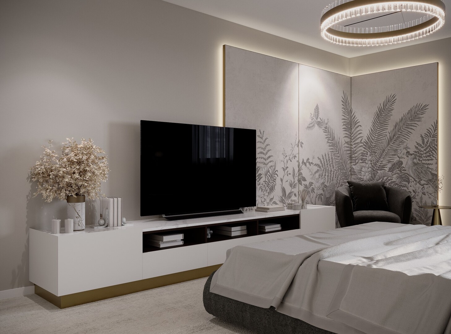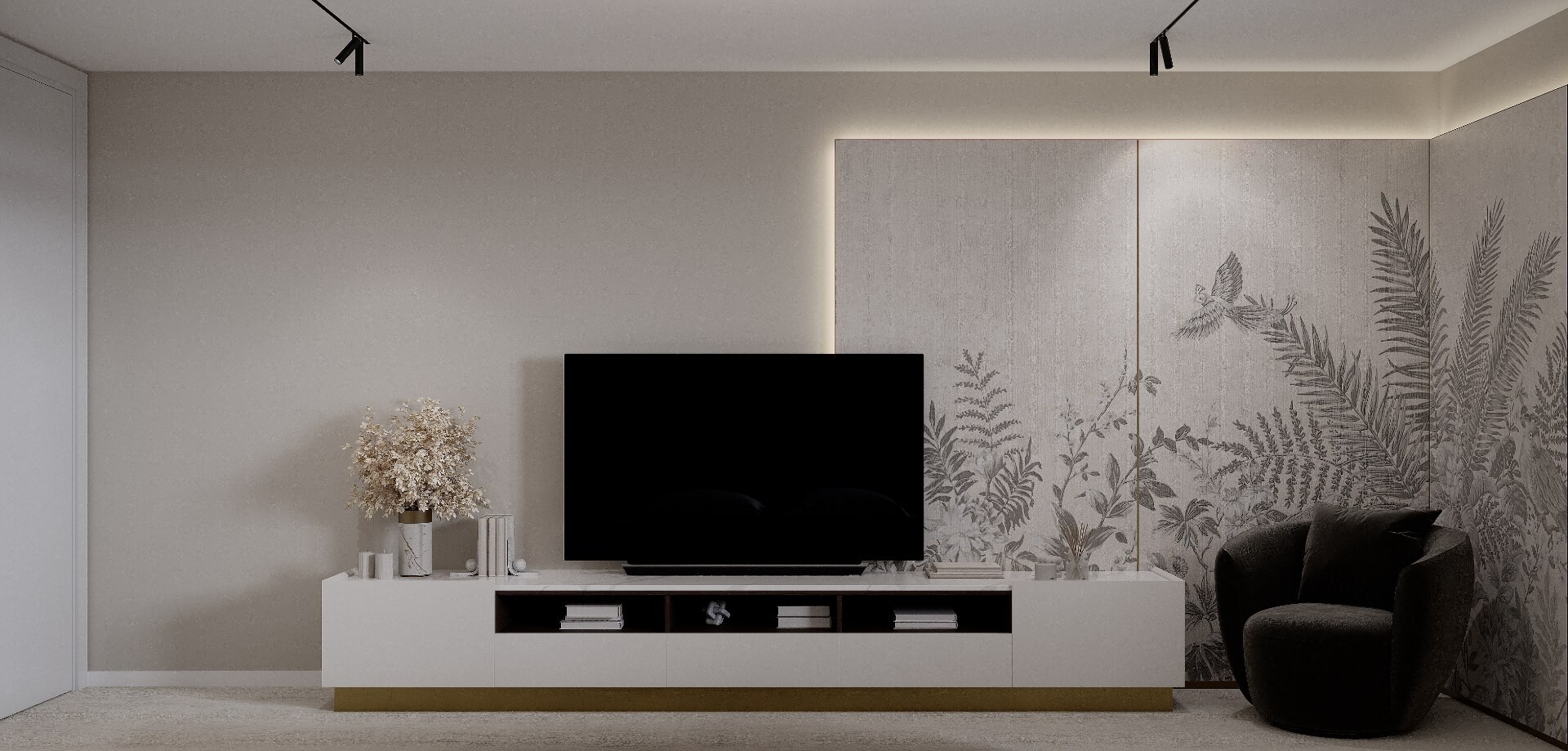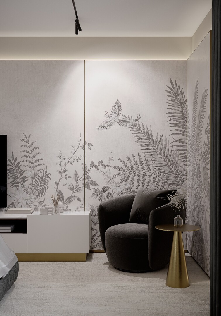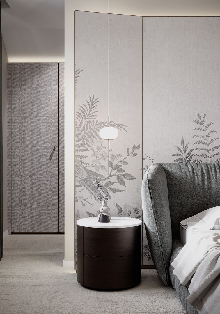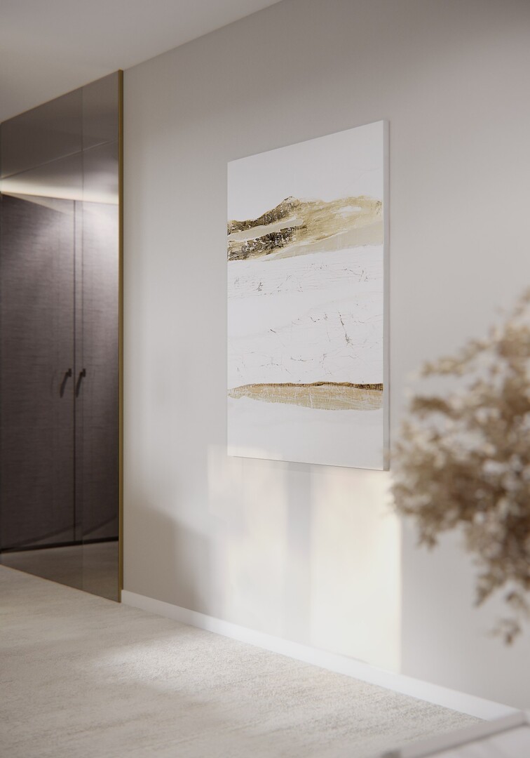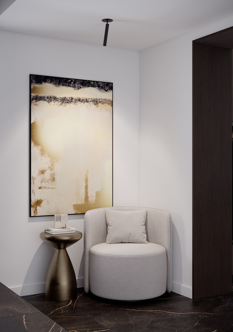 Texturile sunt temperate, iar cromatica este redusă la nuanțe neutre calde, pentru a susține o atmosferă calmă și echilibrată.