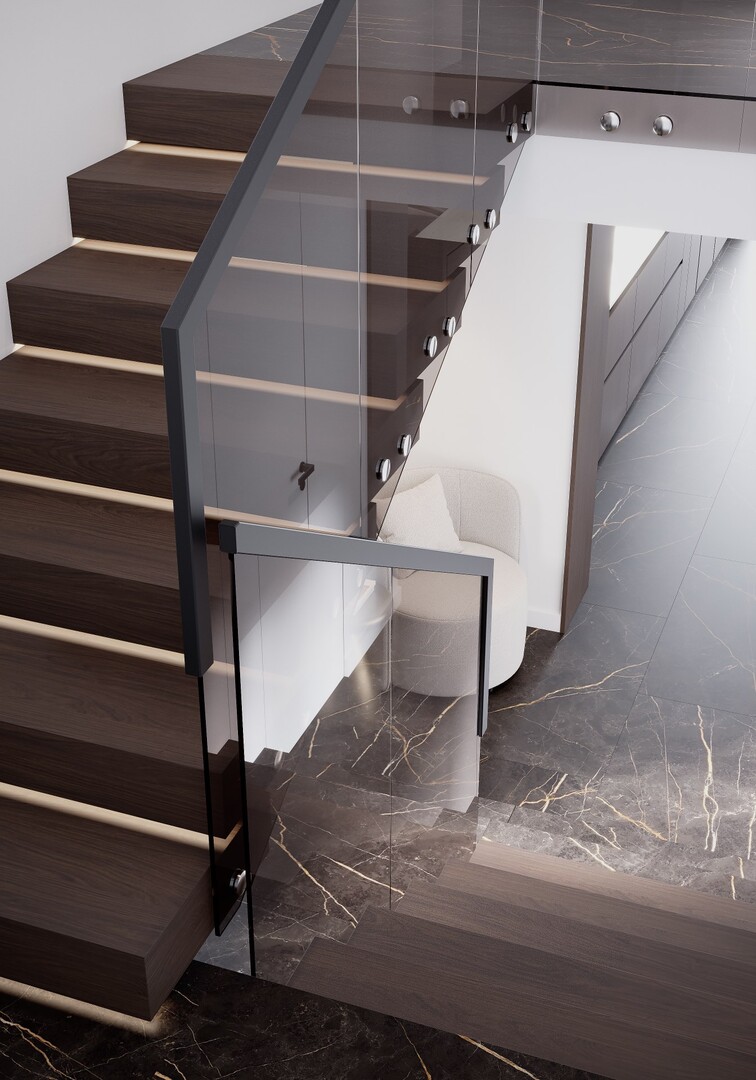 Scara interioară introdusă devine elementul central al reconversiei. Treptele din lemn, iluminate discret, și balustrada din sticlă securizată păstrează transparența și permit luminii să circule între niveluri. Ea marchează trecerea dintre vechea structură și noua organizare, devenind un pivot arhitectural al casei.