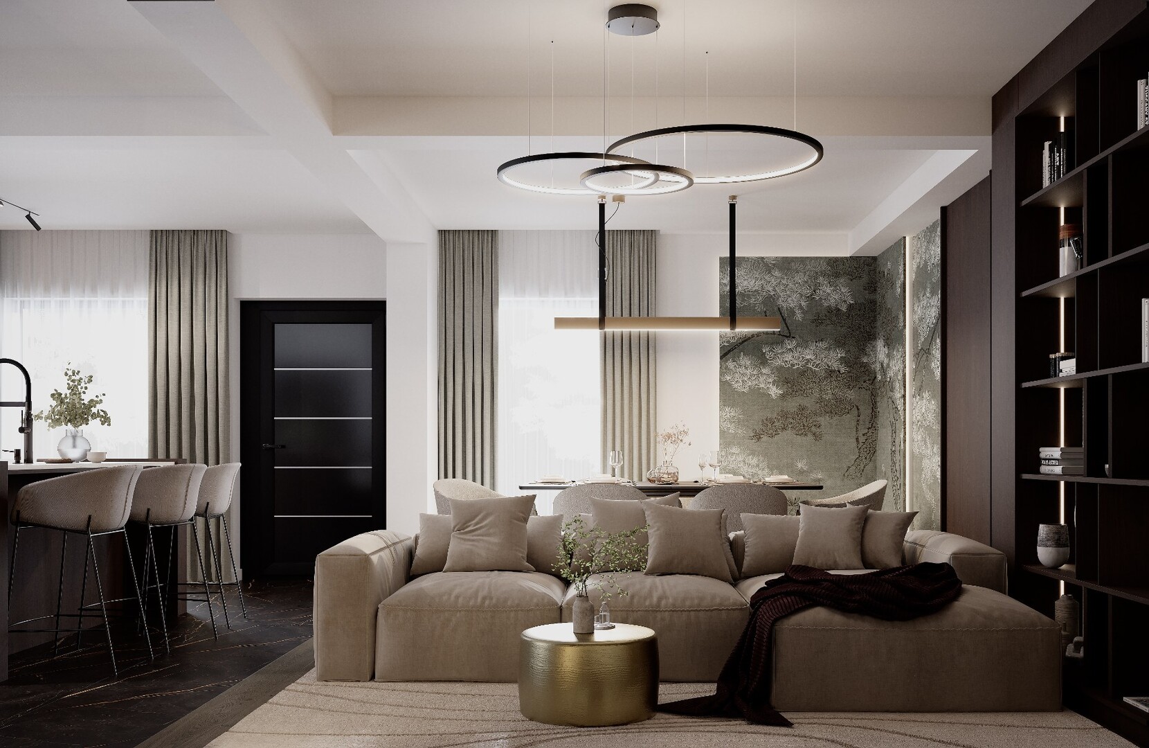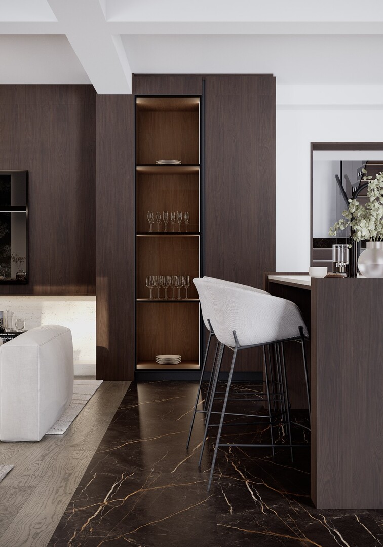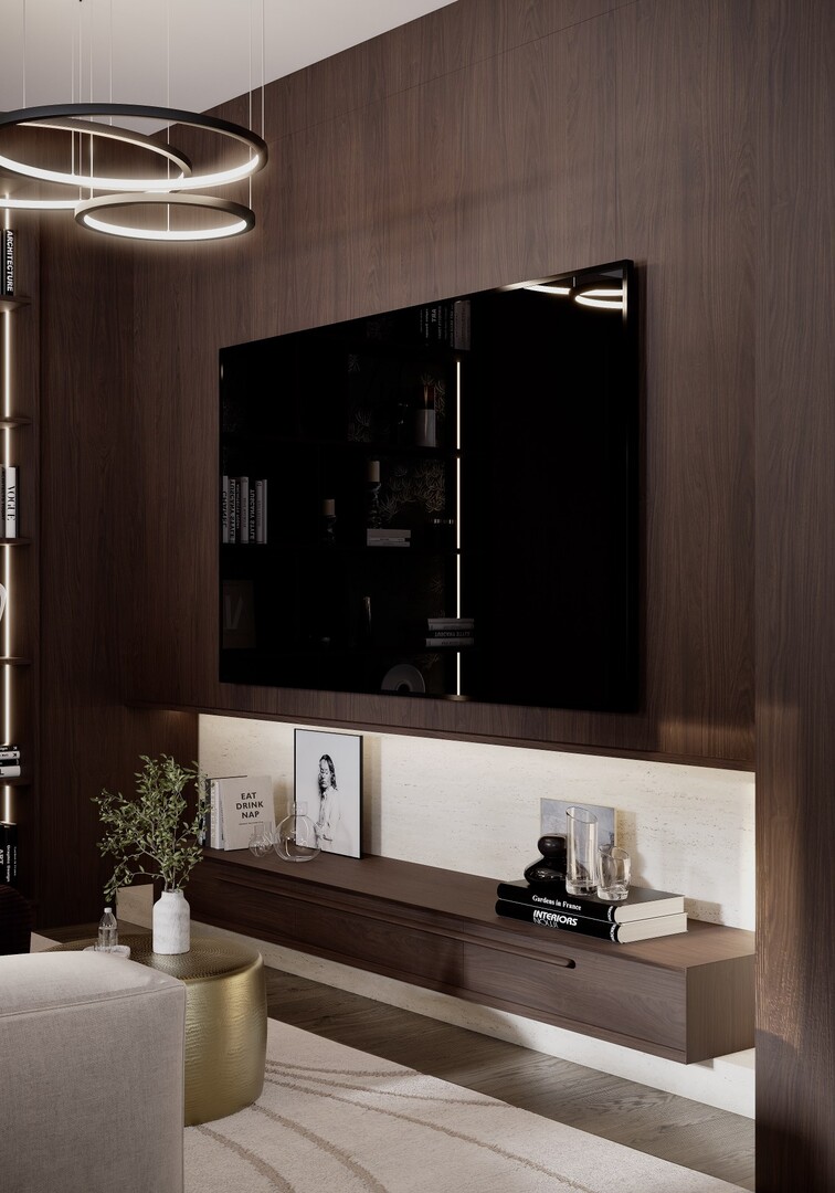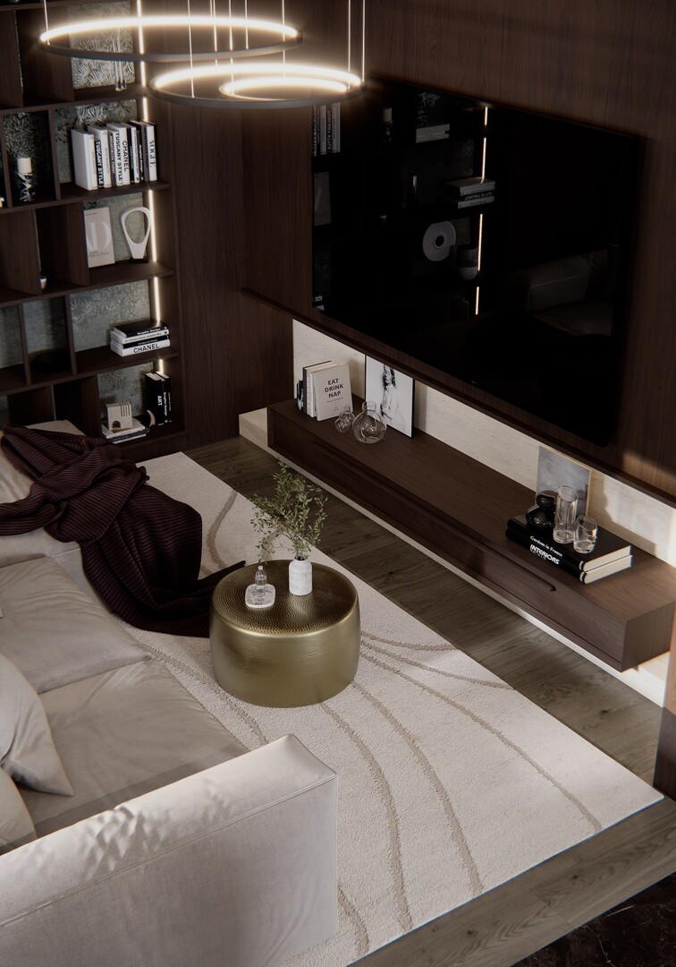 Livingul este definit de un perete amplu placat în furnir închis, care integrează biblioteca, zona media și depozitările ascunse. Iluminarea indirectă subliniază verticalele și adaugă profunzime compoziției. Canapeaua modulară, în tonuri neutre calde, temperează prezența volumelor dense și creează o atmosferă echilibrată.