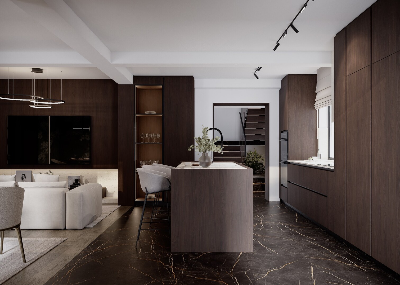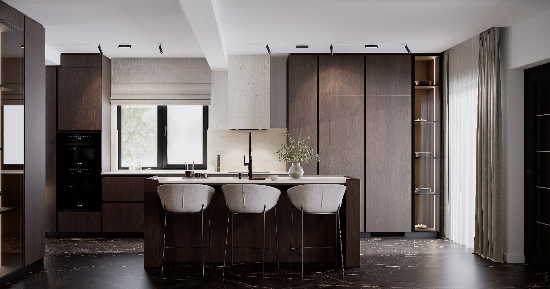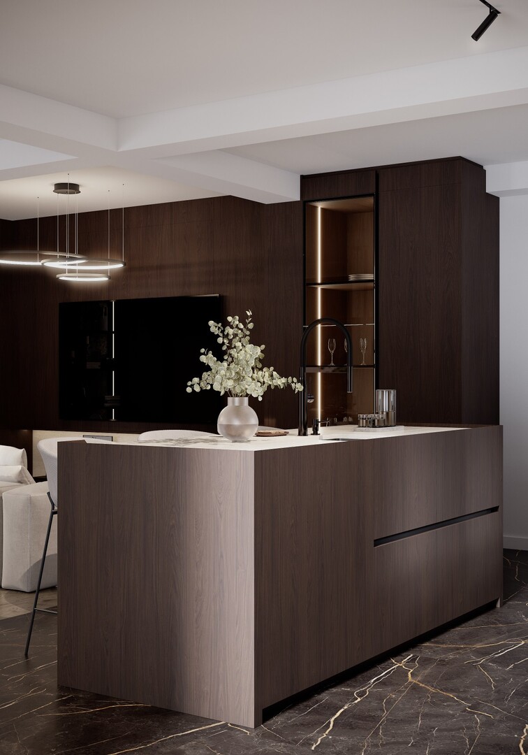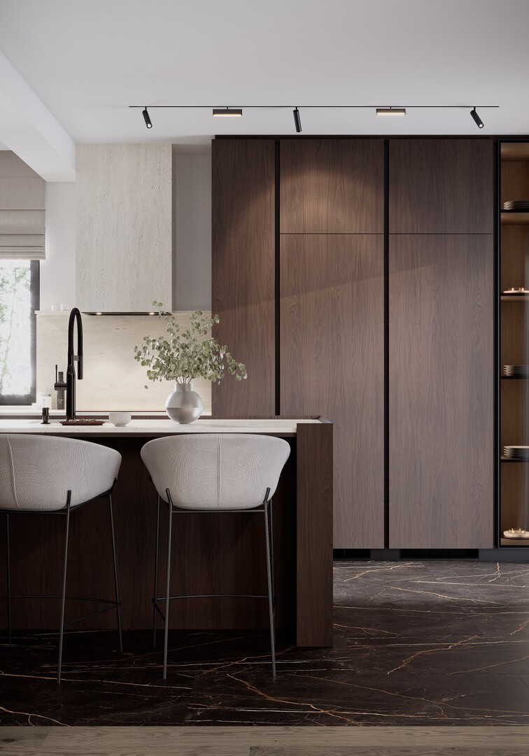 Bucătăria este concepută ca un volum compact, aproape monolitic. Insula centrală, placată integral în furnir închis, funcționează atât ca zonă de lucru, cât și ca punct social. Blaturile deschise la culoare echilibrează compoziția, iar iluminarea integrată accentuează liniile curate și proporțiile.