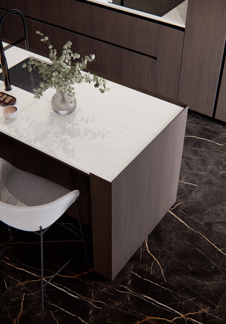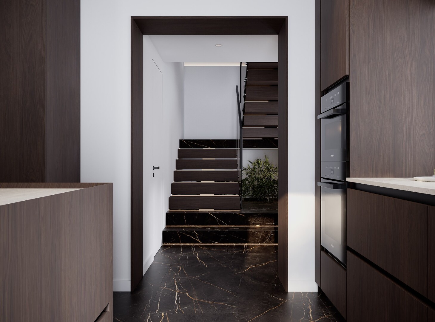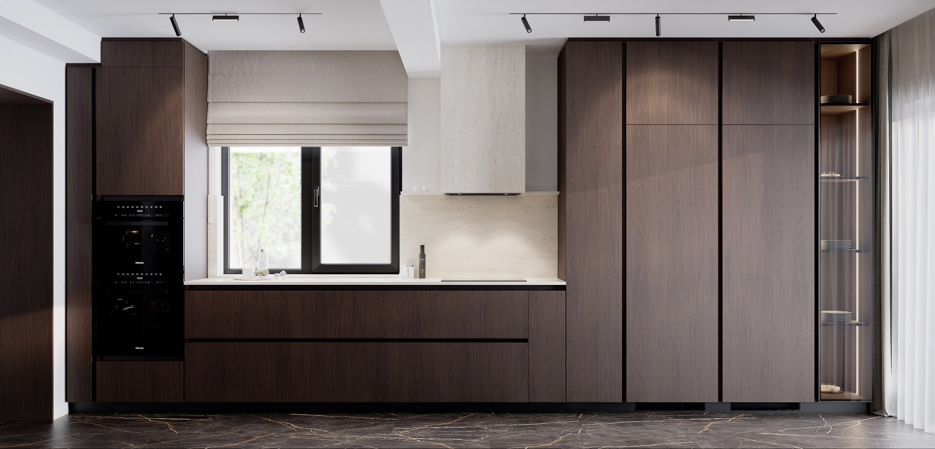 Bucătăria este concepută ca un volum compact, aproape monolitic. Insula centrală, placată integral în furnir închis, funcționează atât ca zonă de lucru, cât și ca punct social. Blaturile deschise la culoare echilibrează compoziția, iar iluminarea integrată accentuează liniile curate și proporțiile.