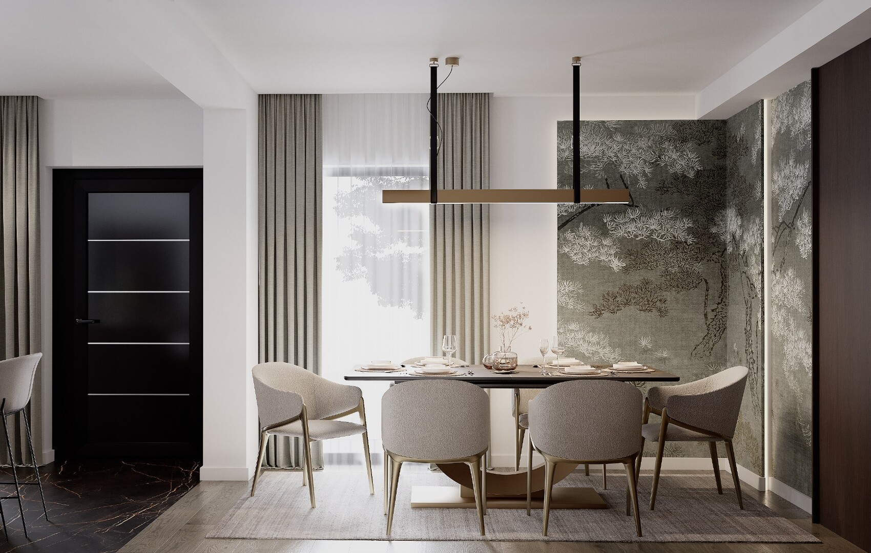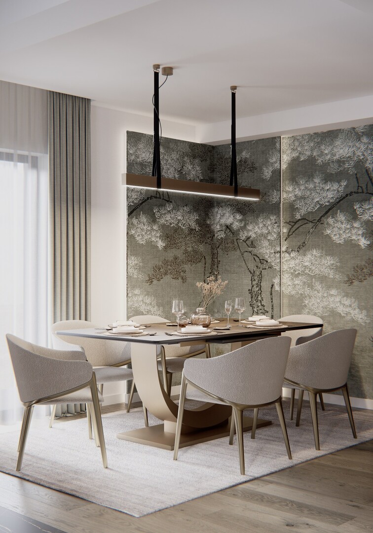 Zona de dining este tratată ca un spațiu cu identitate proprie, definit de un fundal textural cu motiv vegetal discret. Masa cu bază sculpturală și scaunele tapițate adaugă un strat de rafinament, fără a încărca vizual ansamblul.