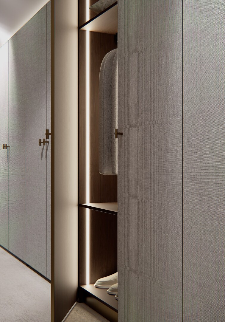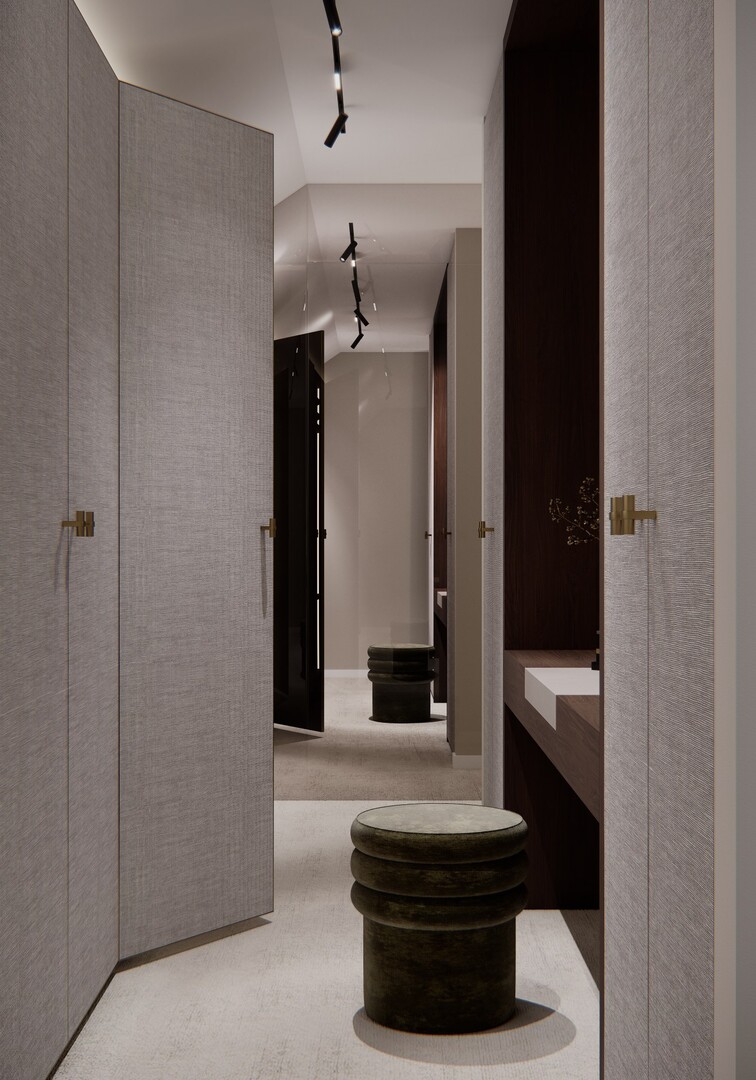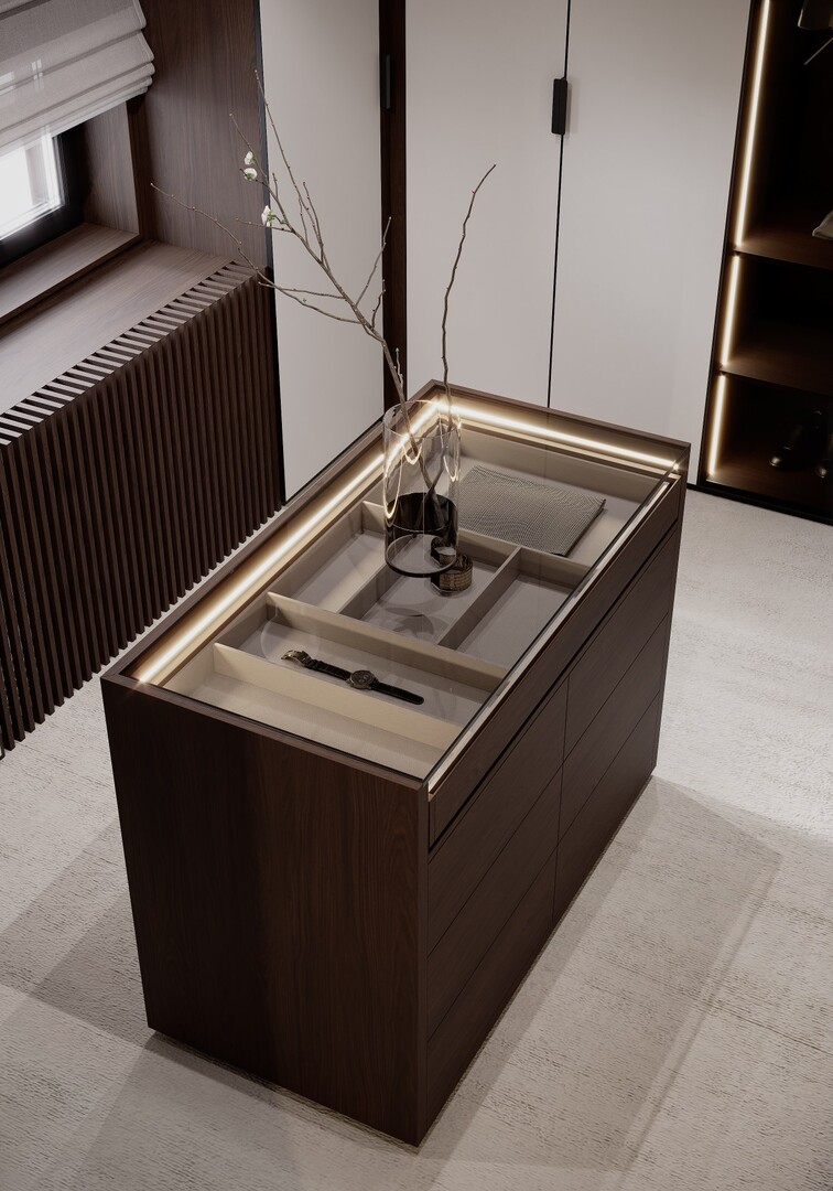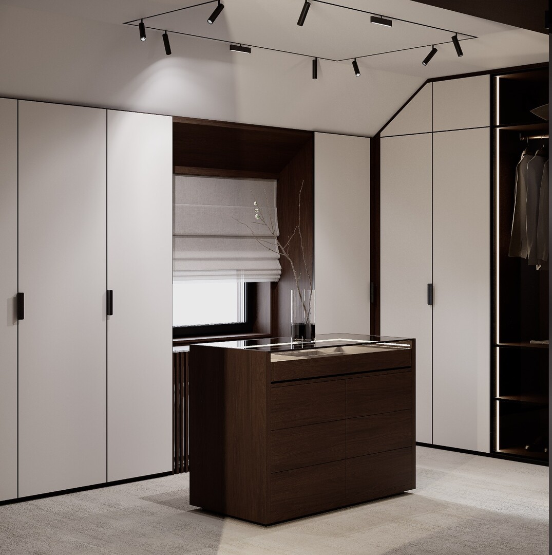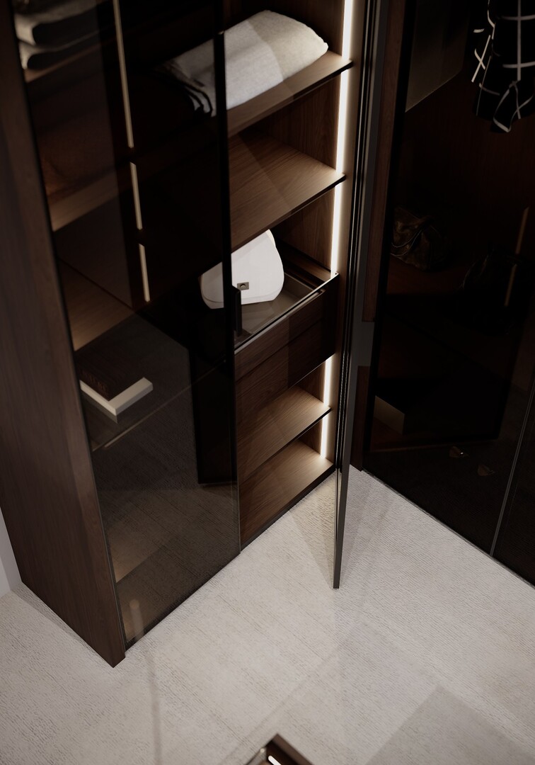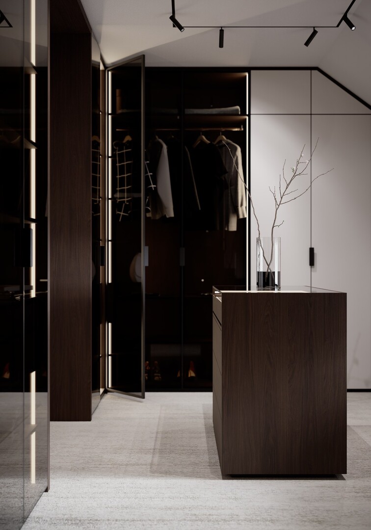 Dressingul walk-in este conceput ca un spațiu organizat riguros, cu vitrine din sticlă fumurie, iluminare integrată și insulă centrală pentru accesorii. Materialele păstrează continuitatea cu zona de zi, consolidând unitatea întregii case.