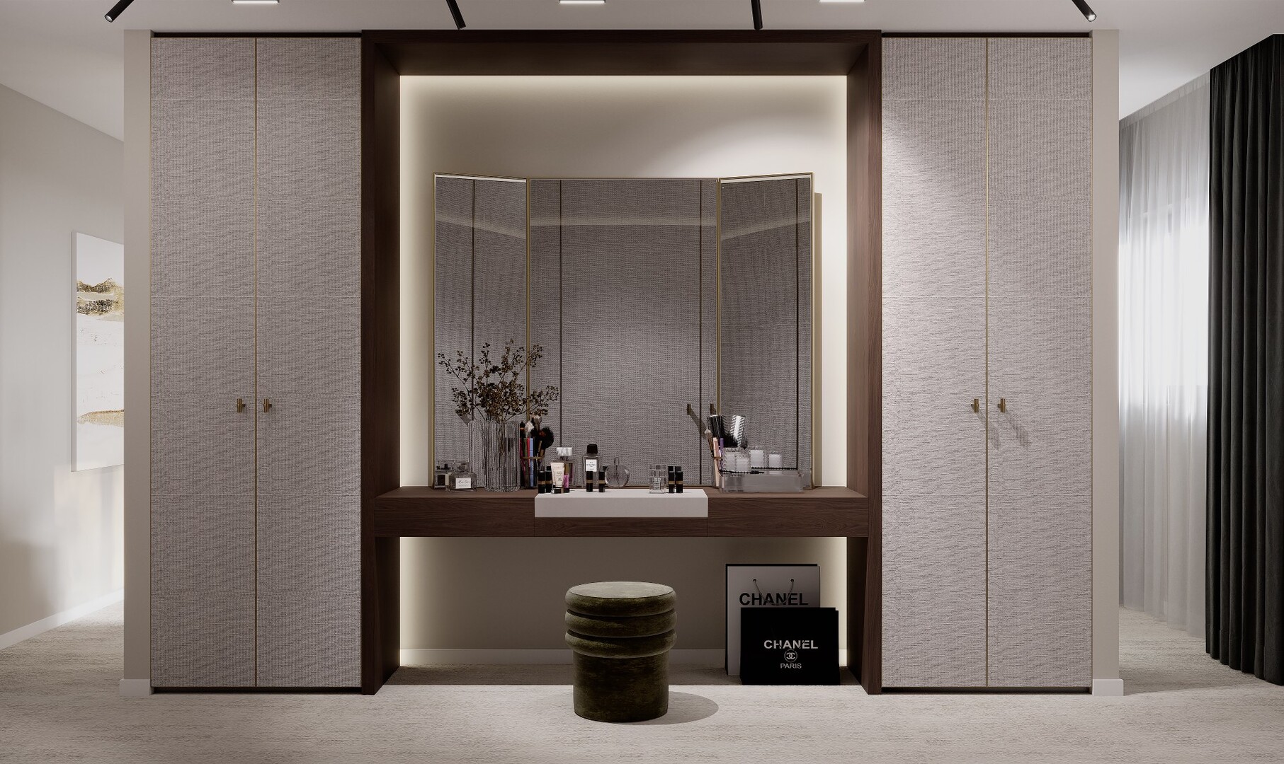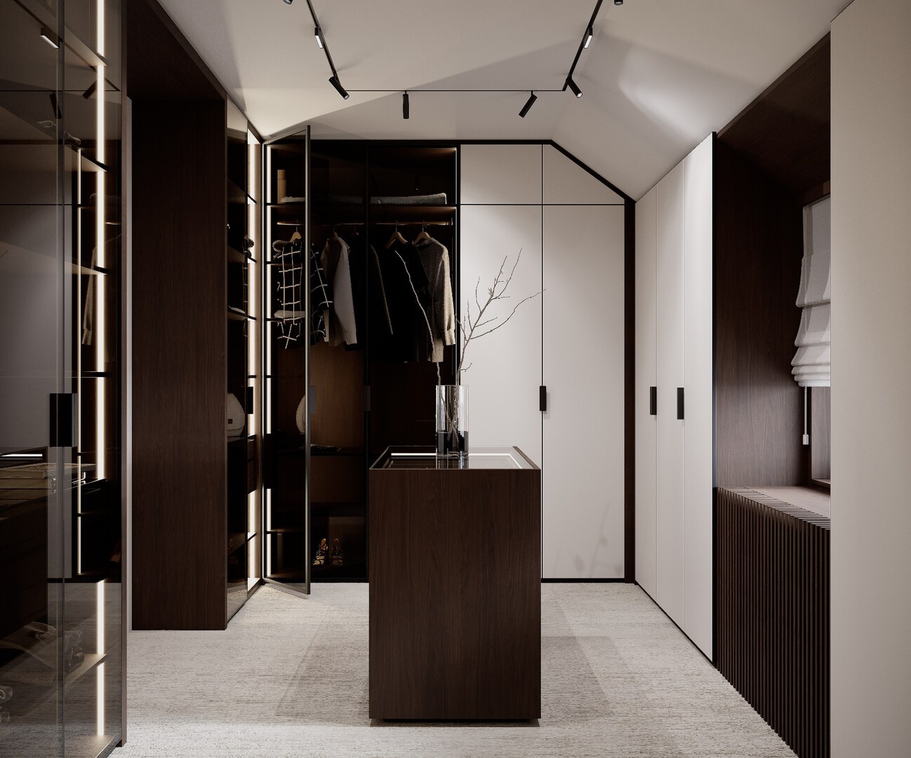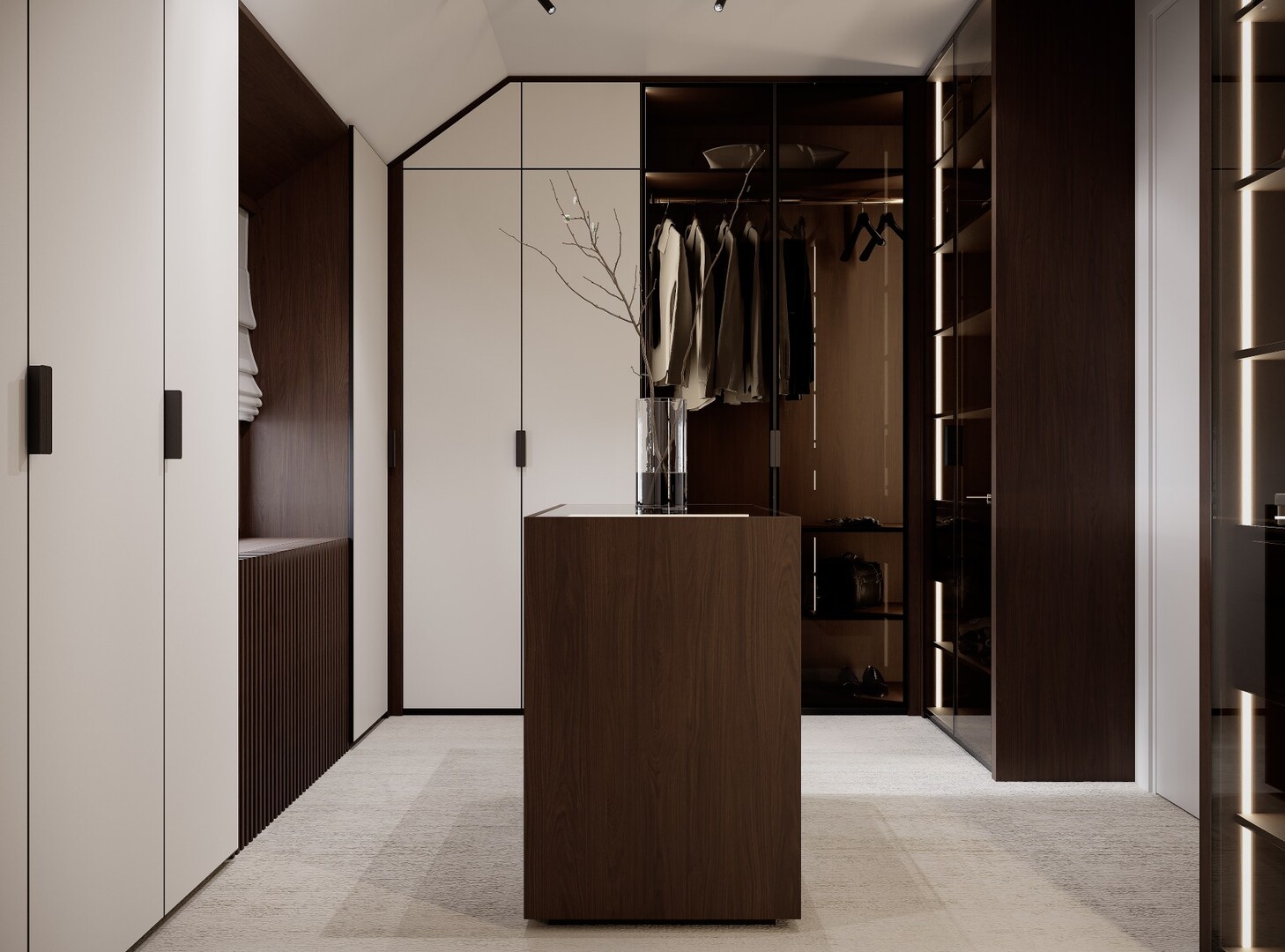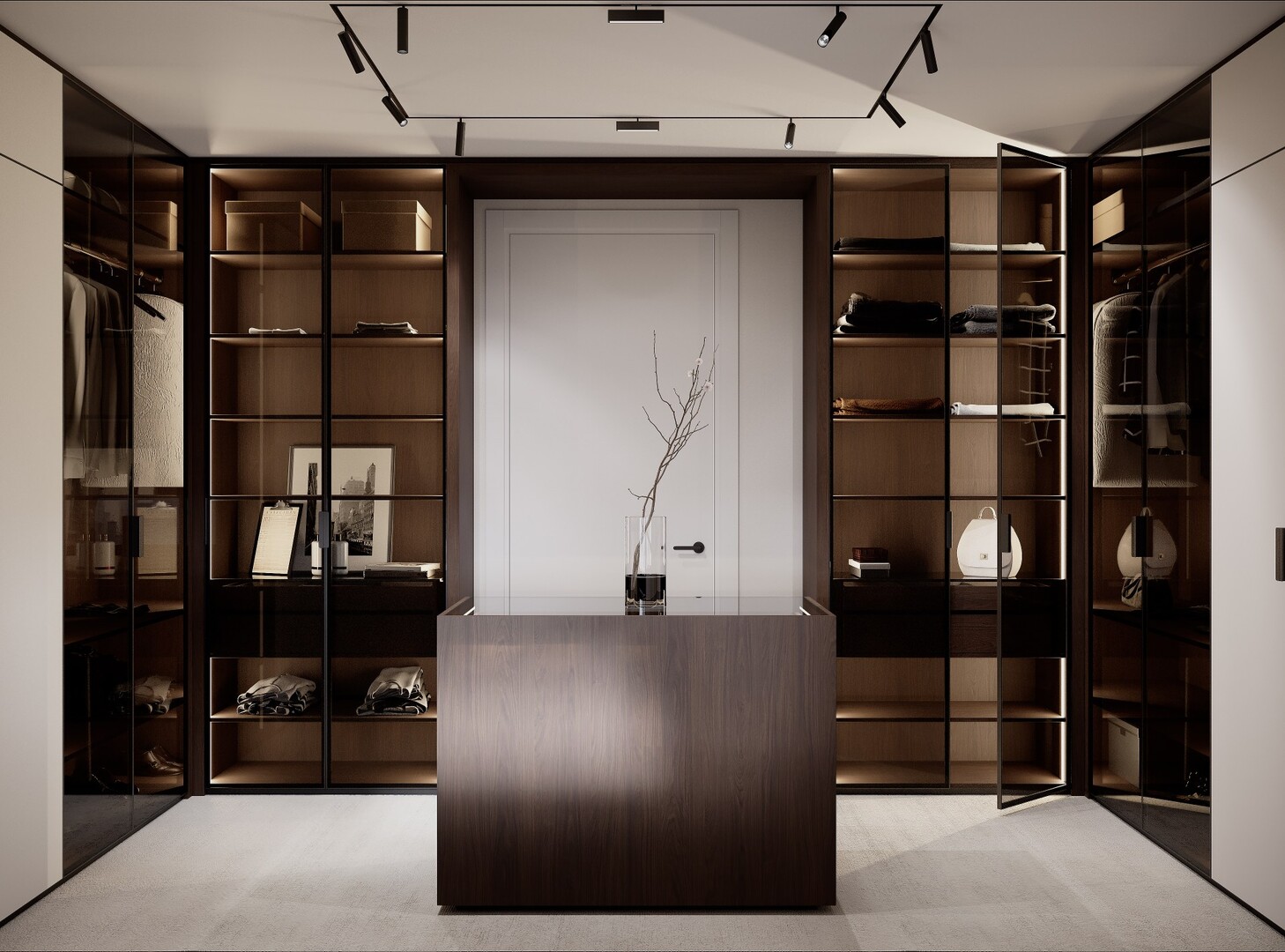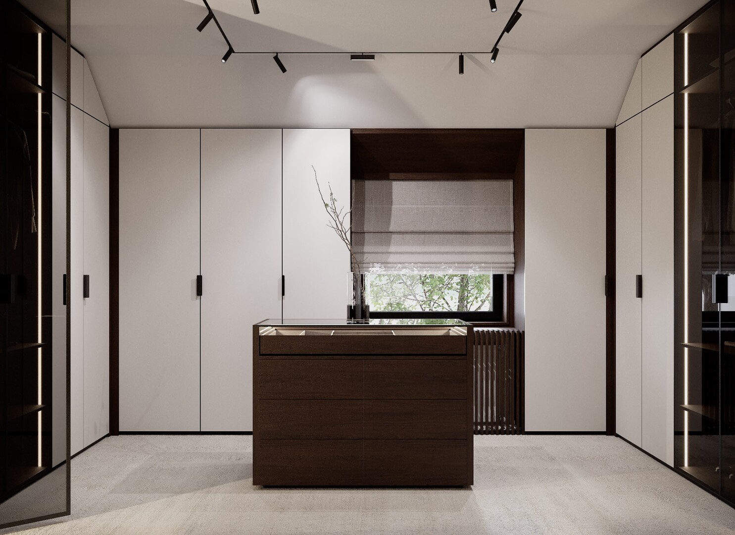 Dressingul walk-in este conceput ca un spațiu organizat riguros, cu vitrine din sticlă fumurie, iluminare integrată și insulă centrală pentru accesorii. Materialele păstrează continuitatea cu zona de zi, consolidând unitatea întregii case.
