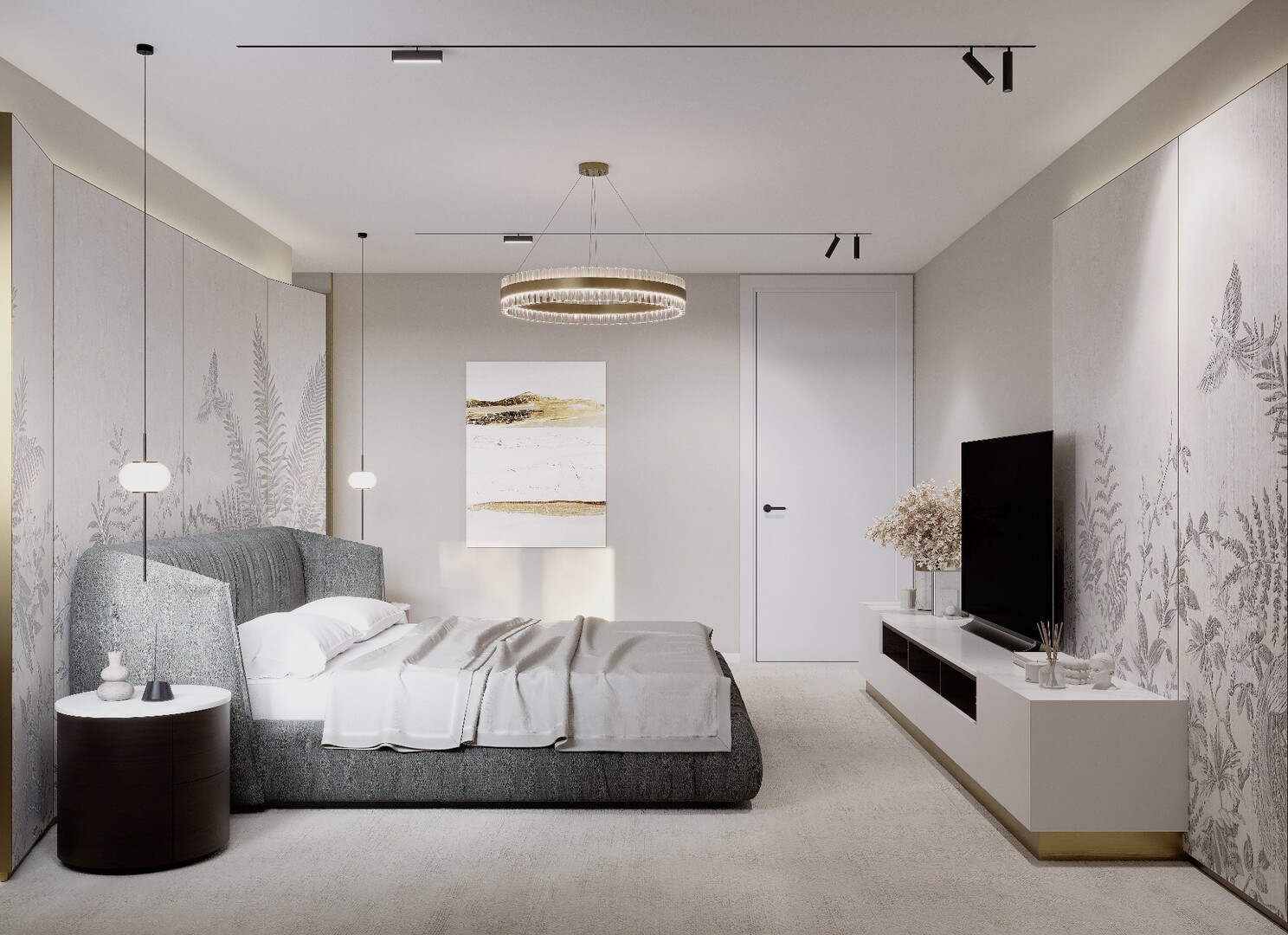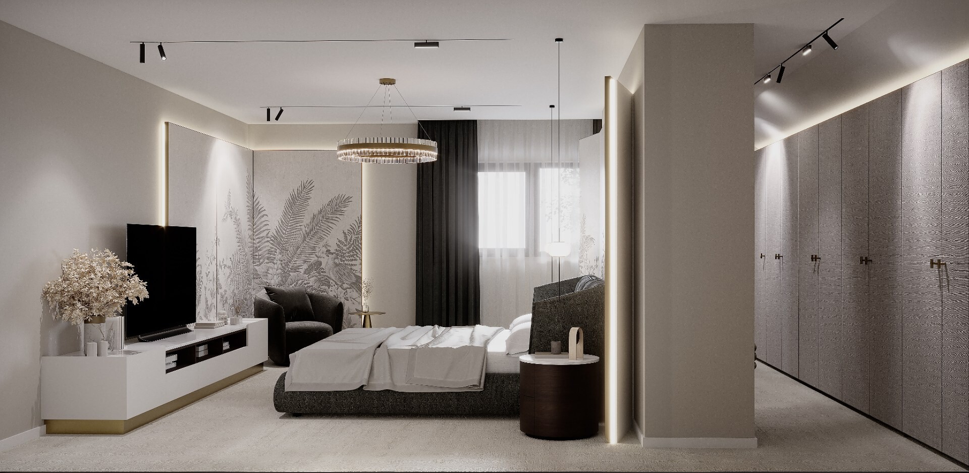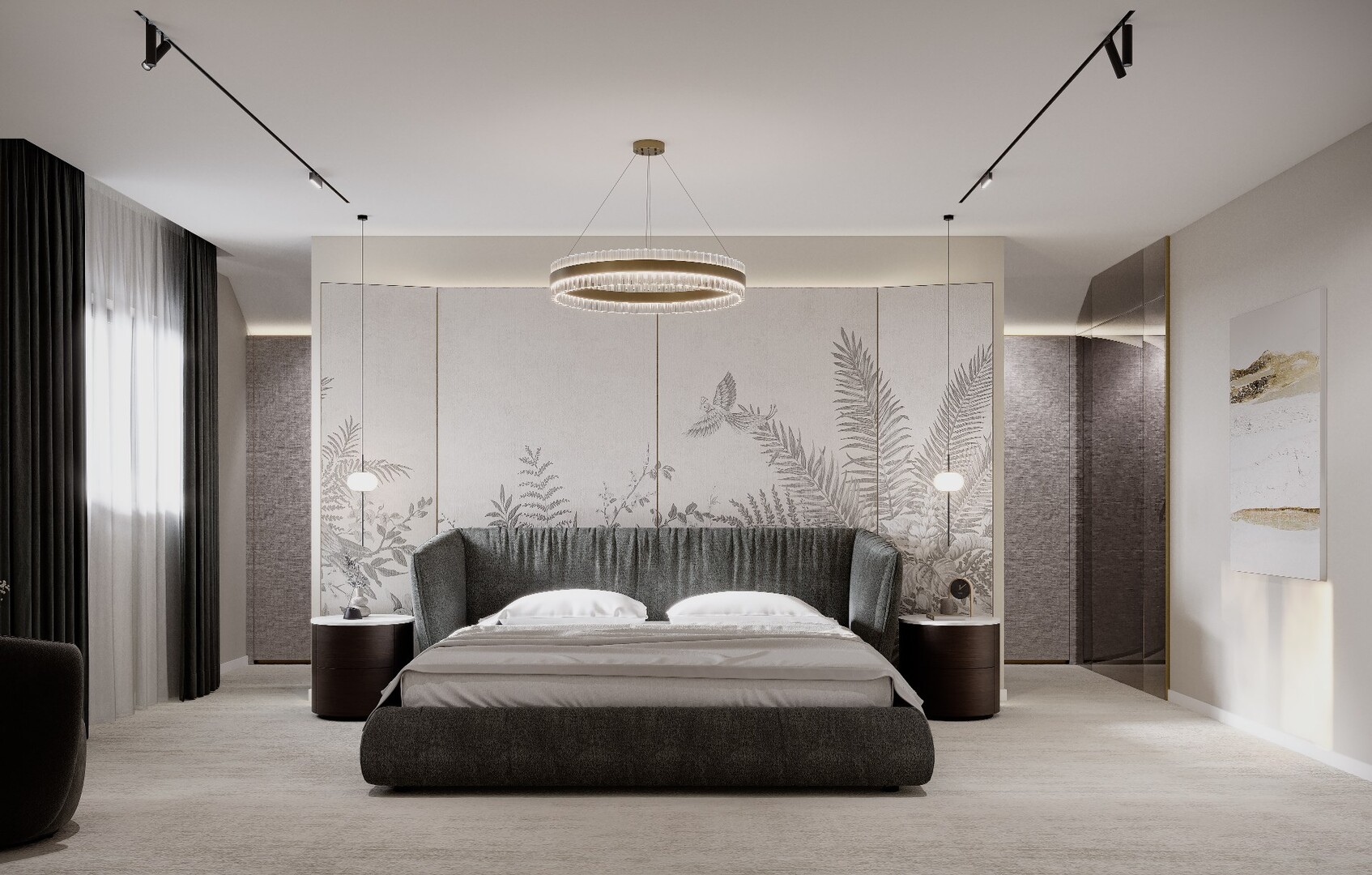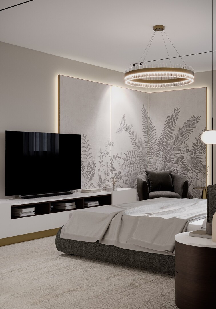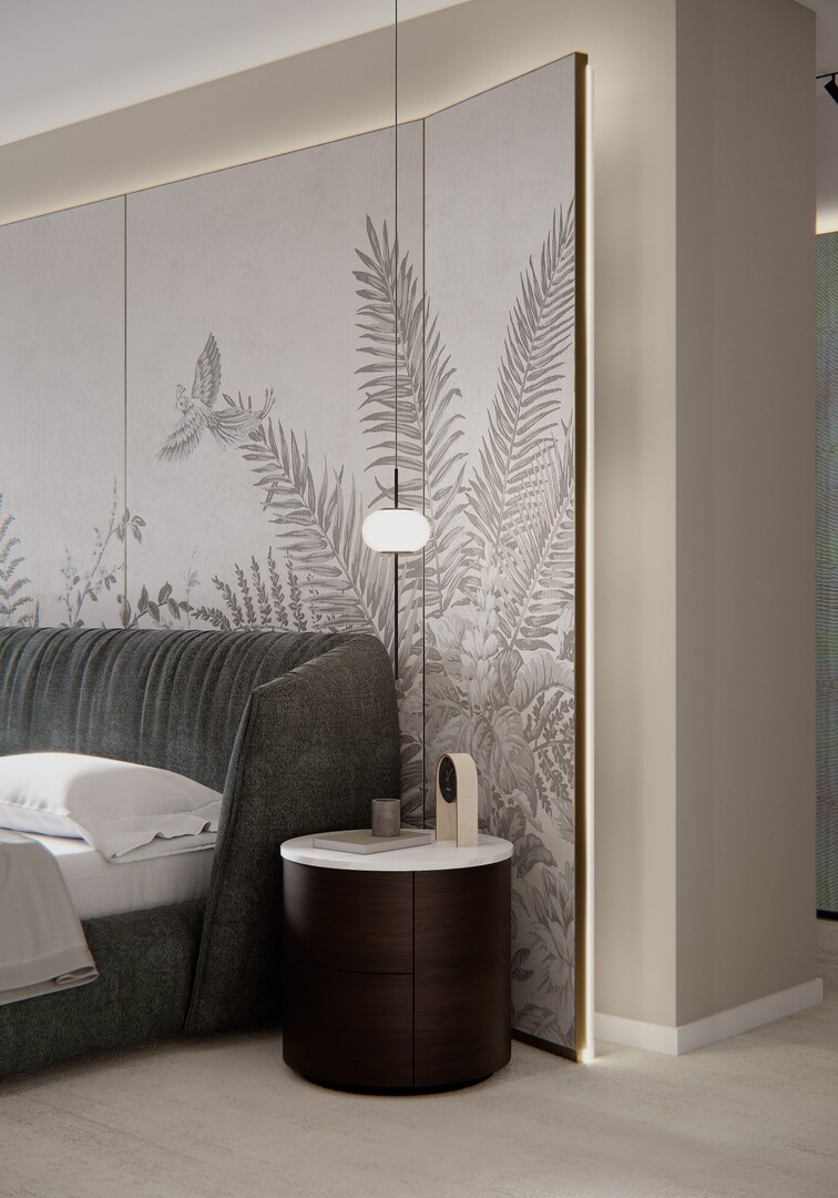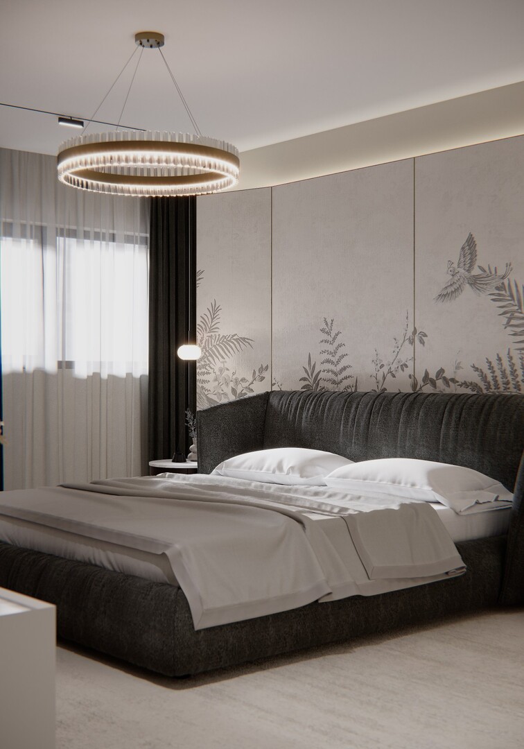 Transformarea mansardei într-un etaj funcțional a permis organizarea clară a zonei private. Dormitorul matrimonial este tratat simetric, cu un panou decorativ amplu, iluminat perimetral, care creează profunzime și devine fundalul principal al compoziției.