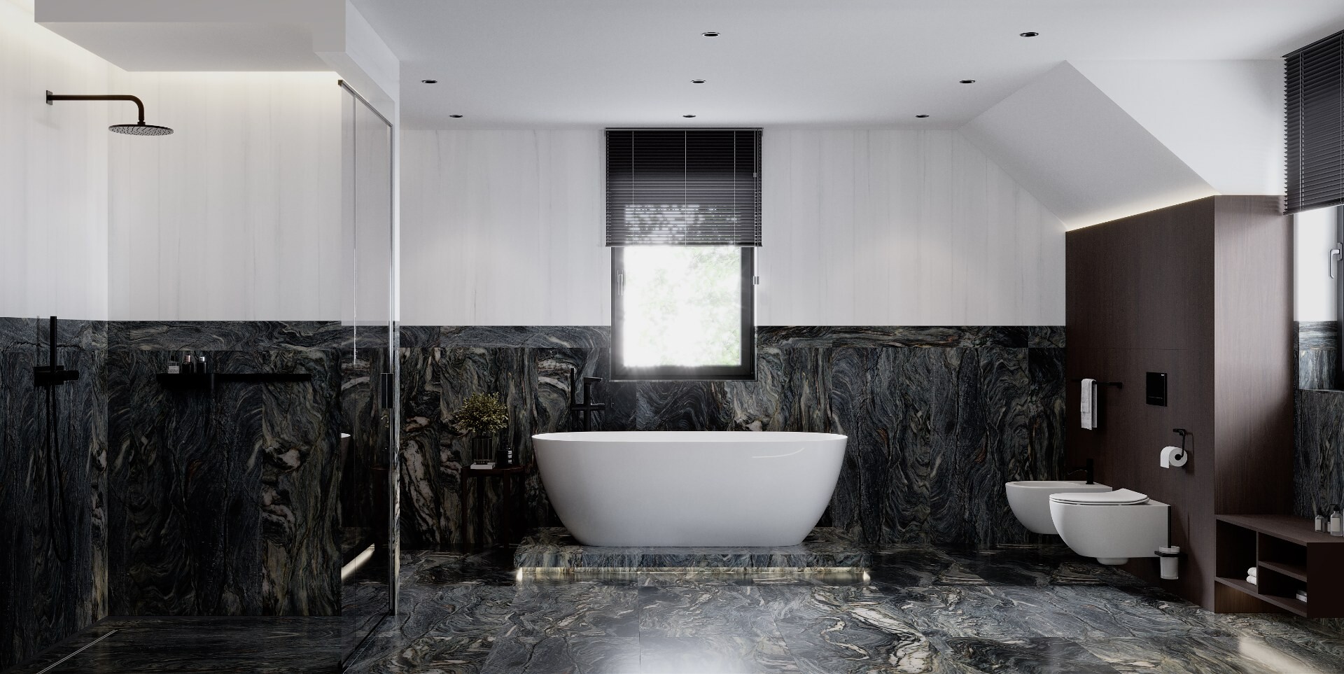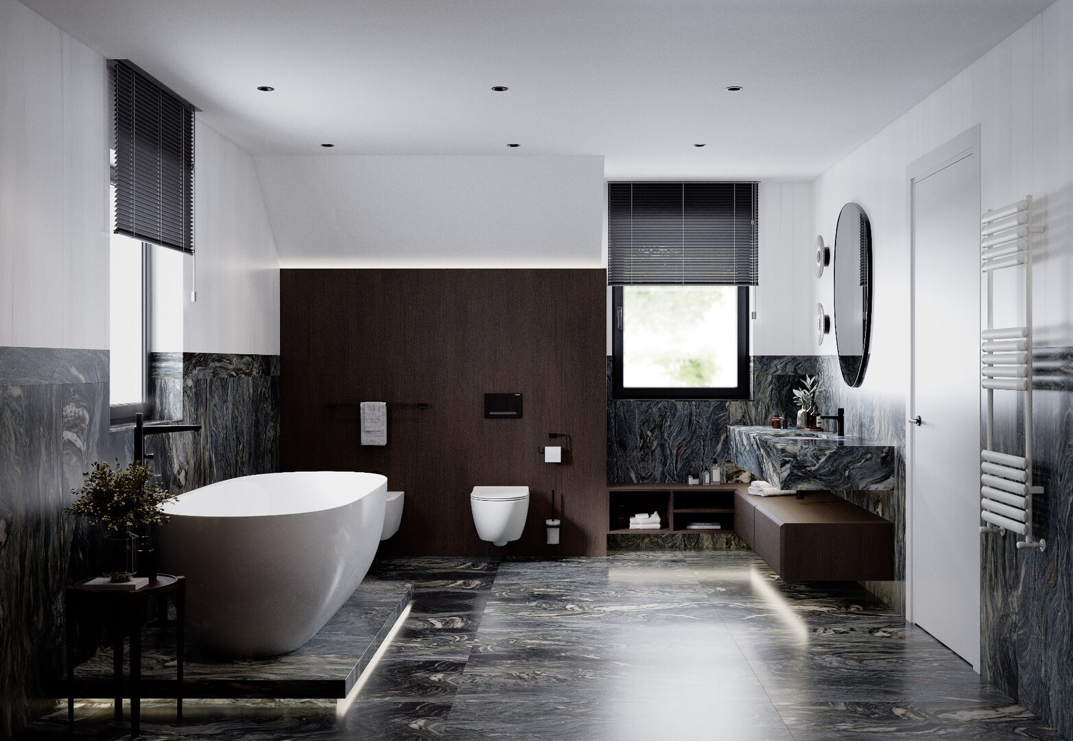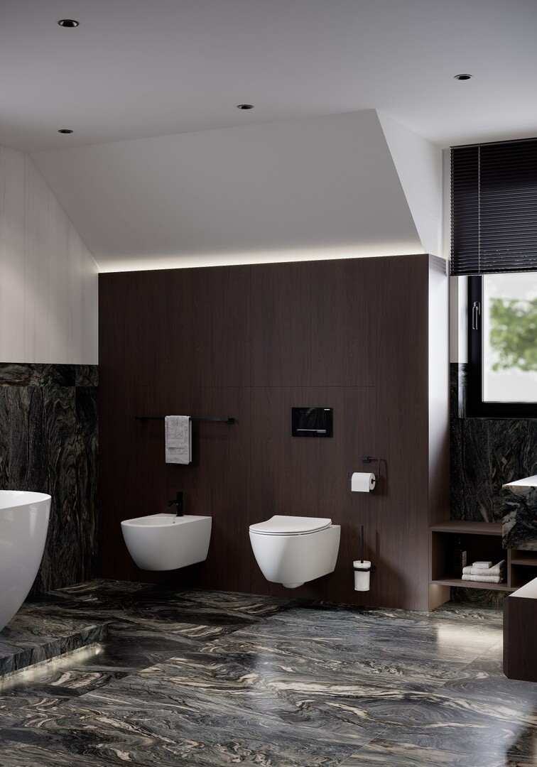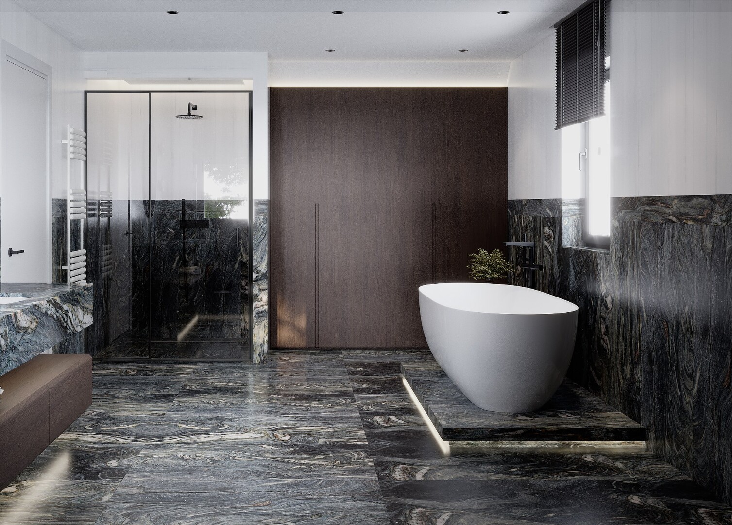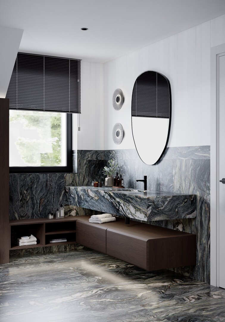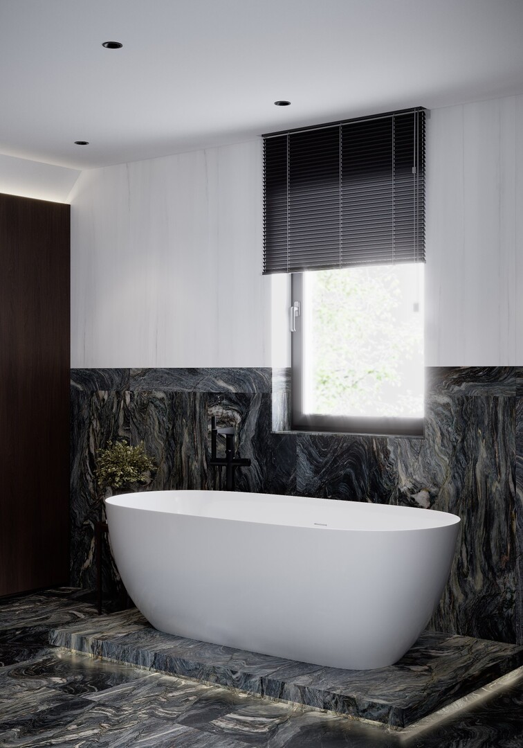 Baia explorează un contrast puternic între volumele din furnir închis și gresia porțelanată cu desen mineral amplu. Cada freestanding, așezată pe un podium iluminat discret, devine punctul focal al compoziției.