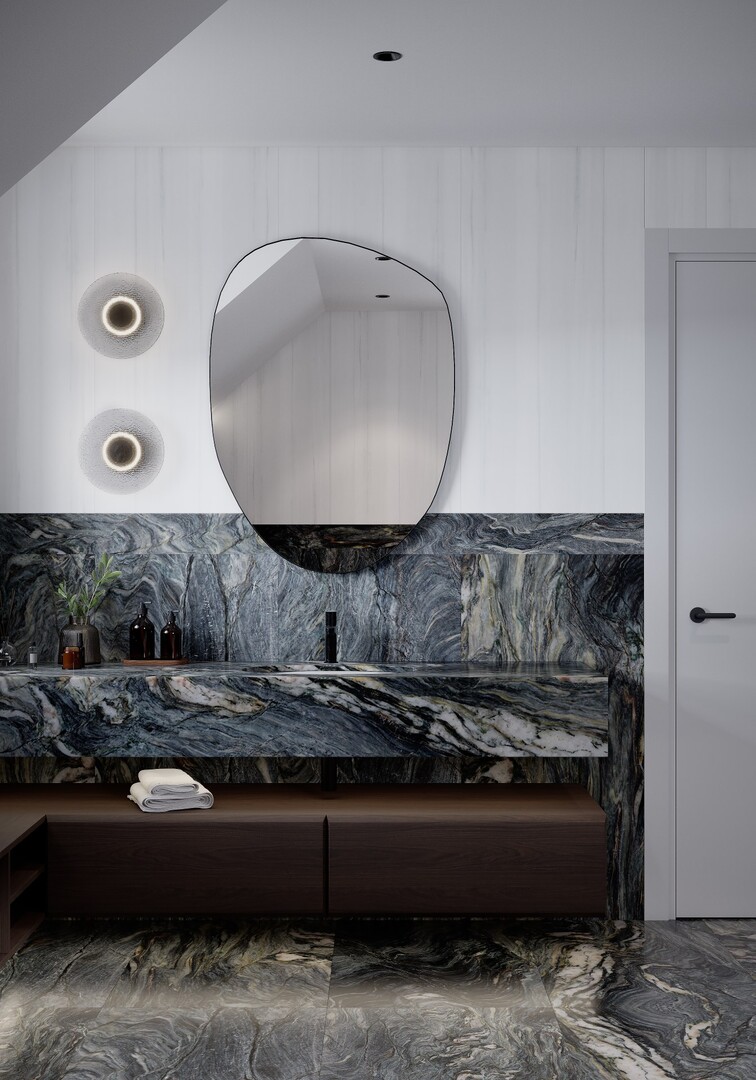 Lavoarul sculptural și mobilierul suspendat păstrează continuitatea, în timp ce iluminarea indirectă accentuează texturile și adâncimea materialelor.